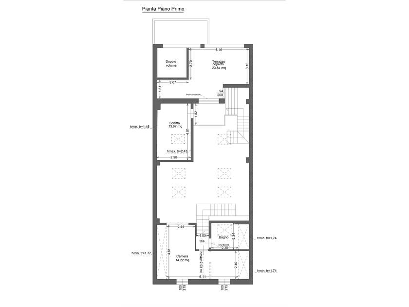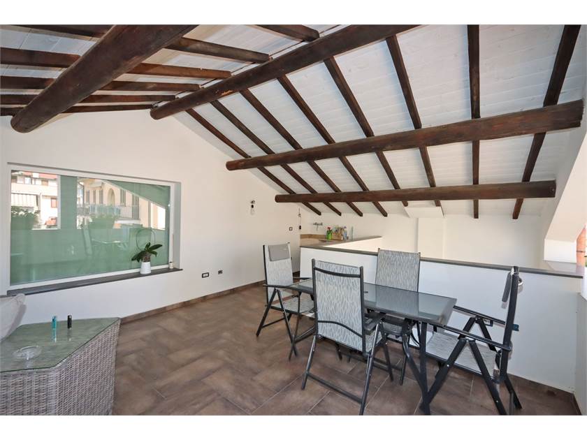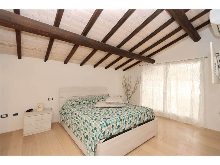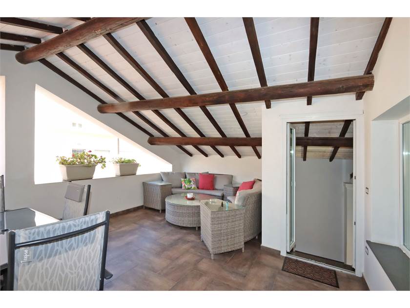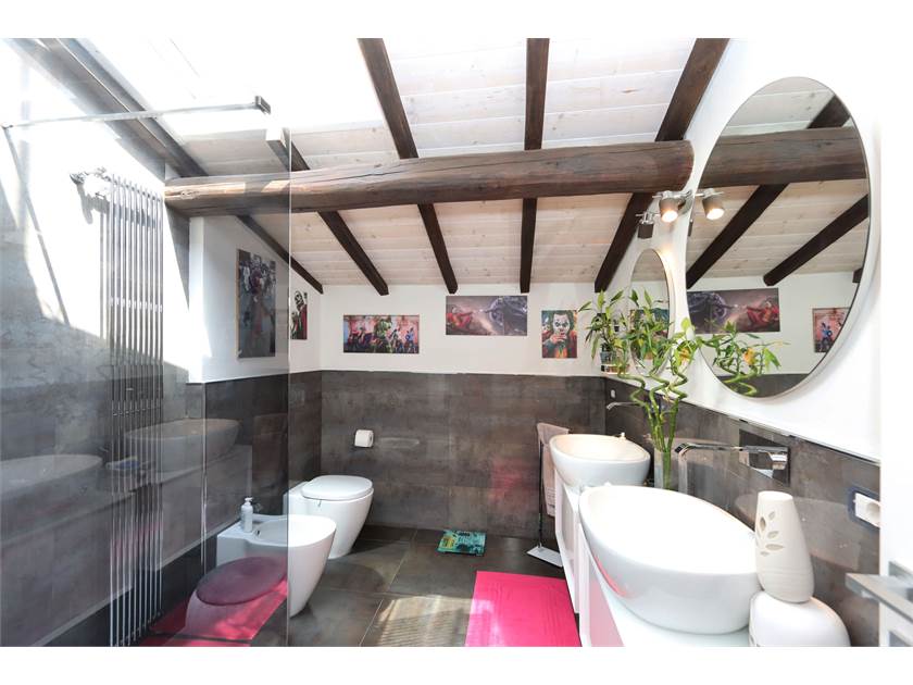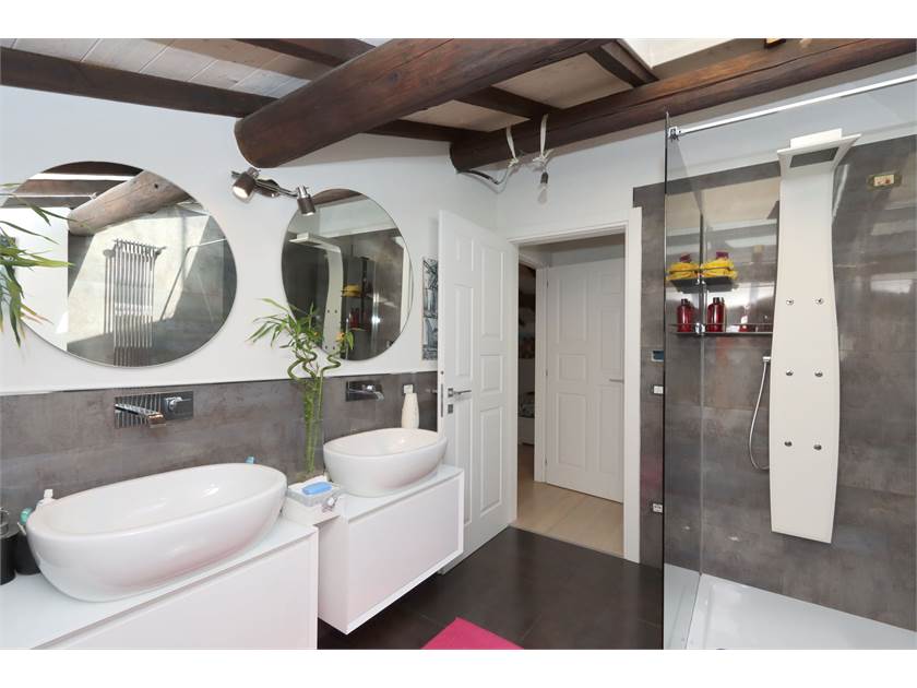 Dal salone partono due scale interne, anch'esse costruite con materiali di prestigio (Pietra Fossena e parapetto in vetro) che danno accesso ad una zona composta da camera matrimoniale con stanza guardaroba e bagno finestrato con doccia idromassaggio e ad un'altra zona composta da camera mansardata e terrazzo abitabile coperto di 23 mq.