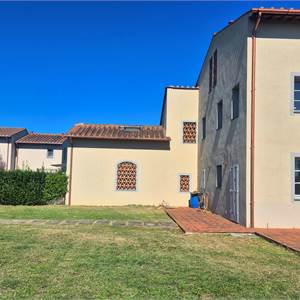Il soggiorno è caratterizzato da un ampio portale vetrato ad arco e soffitto con volta a crociera completamente recuperato; oltre la sala troviamo una splendida cucina abitabile di 33 mq con voltine a mattoni faccia vista e l'accesso al giardino tergale.