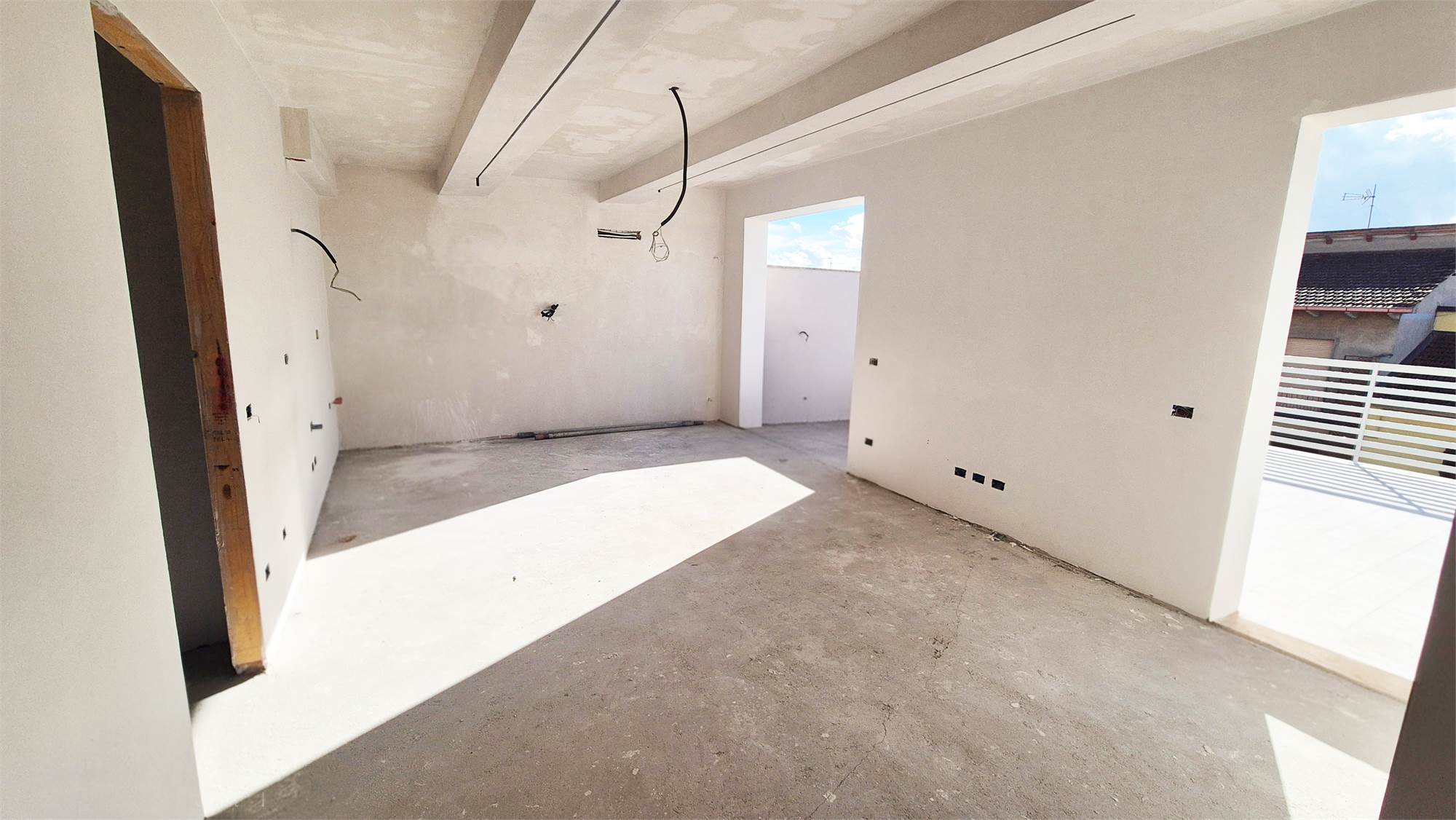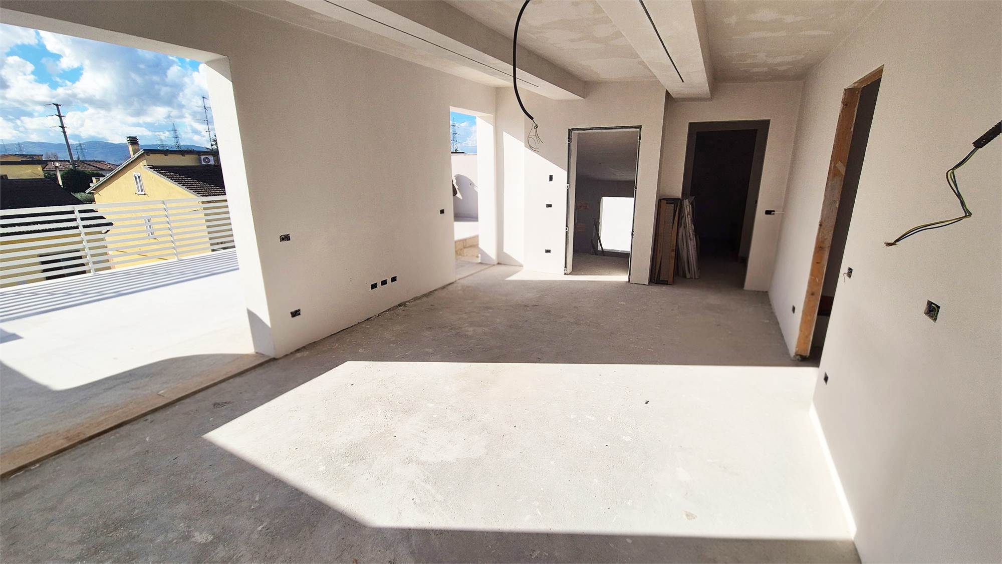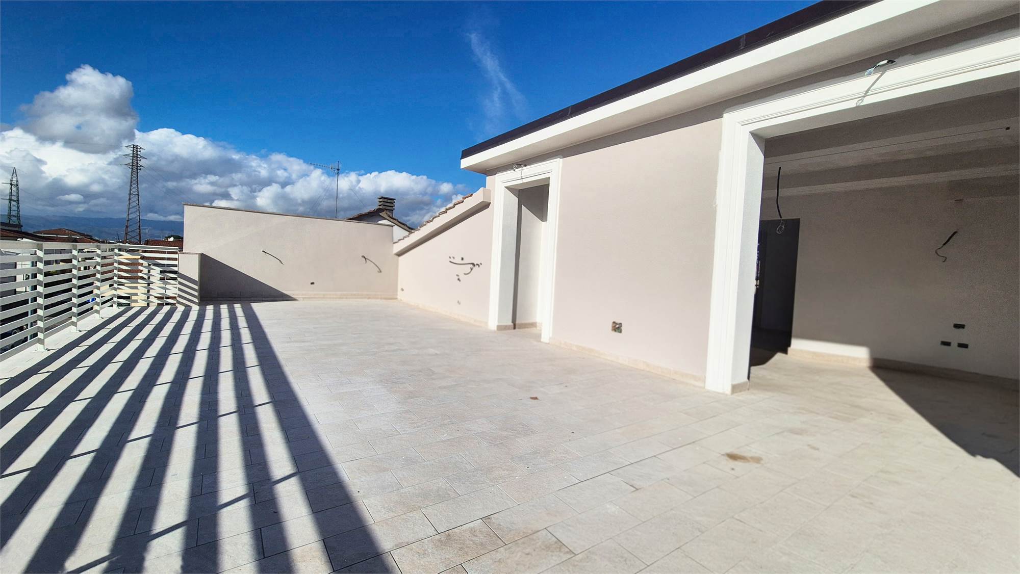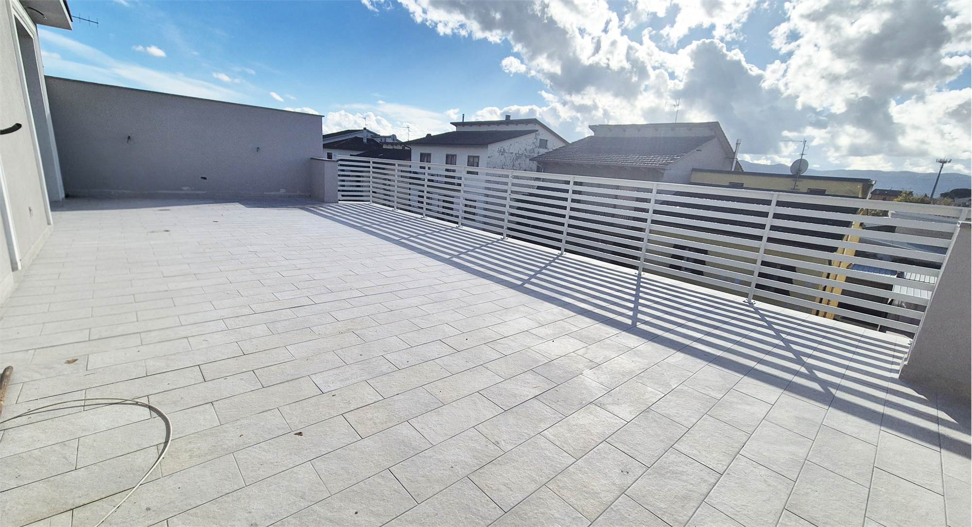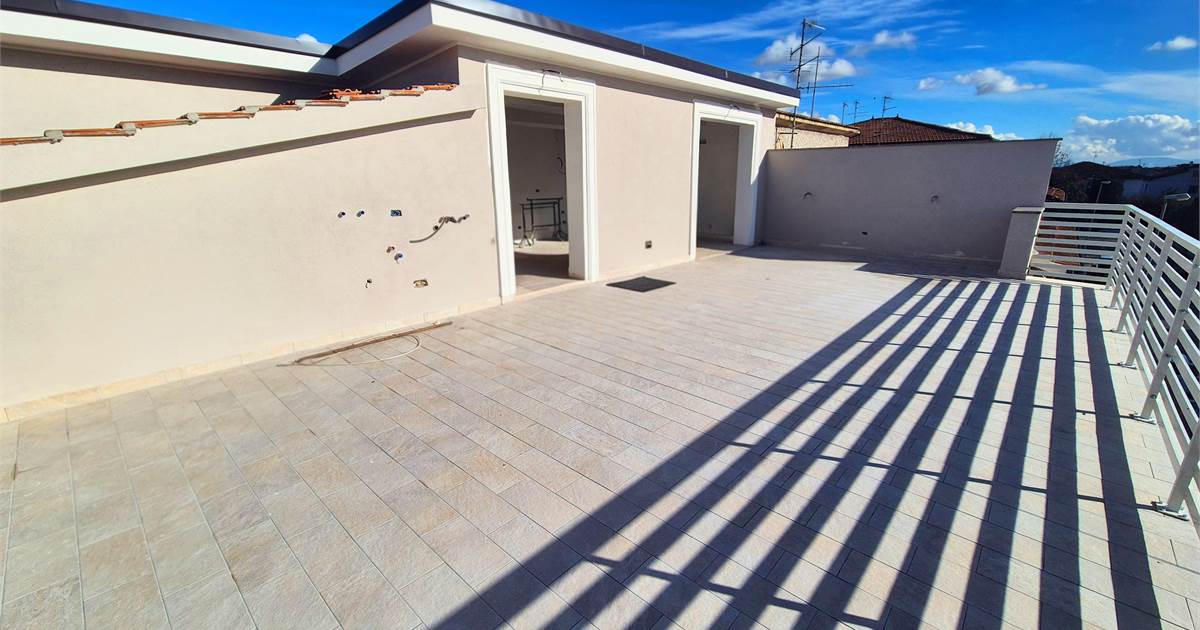 L'appartamento, libero su tre lati, è composto da ingresso su ampia zona soggiorno/cucina con accesso al bellissimo terrazzo abitabile di 50 mq, tre camere da letto (due matrimoniali, una singola ampia), due bagni.