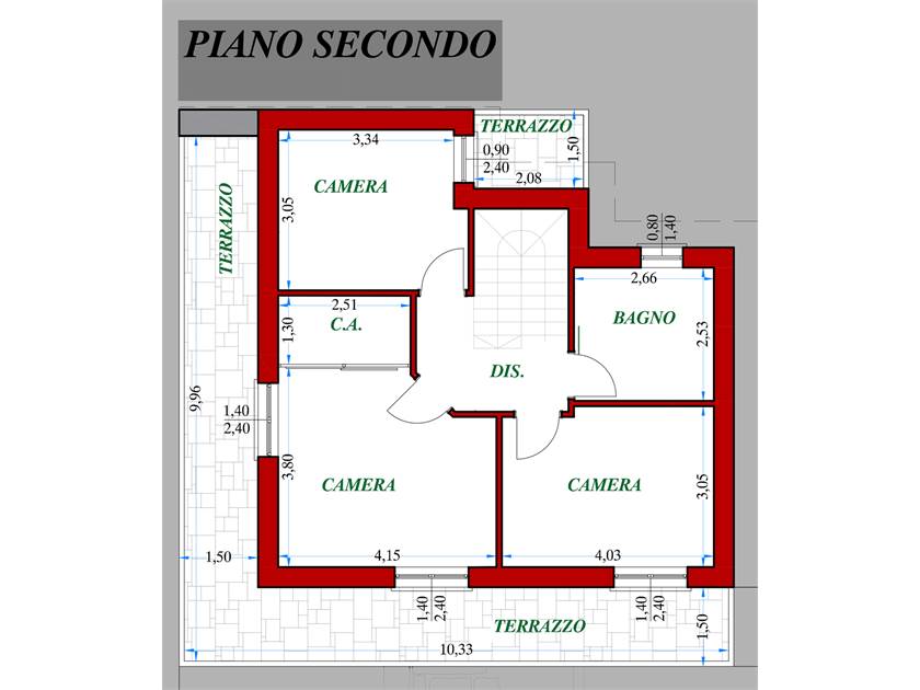 Al piano secondo e ultimo tre ampie camere da letto (di cui una con stanza guardaroba) circondate da un ampio terrazzo su due lati, bagno di 7 mq ed un ulteriore terrazzo.