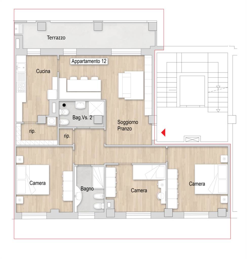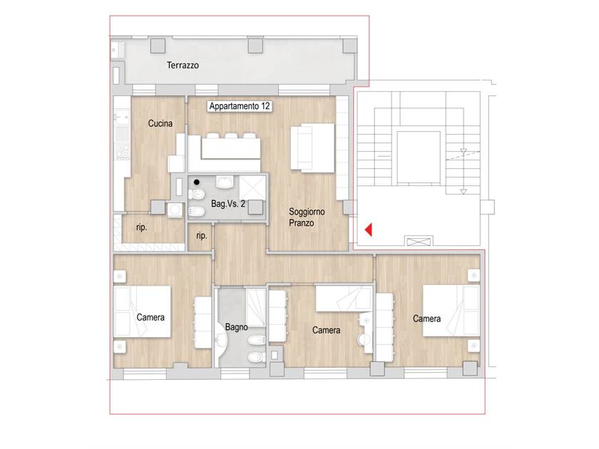 L'appartamento di circa 110 mq sarà composto da ingresso su soggiorno cucina, dispensa, 3 camere (2 matrimoniali + 1 media), ripostiglio, 2 bagni e terrazzo coperto di circa 13 mq.
