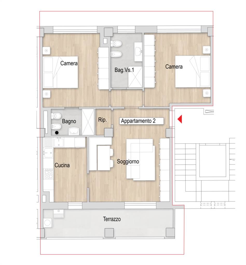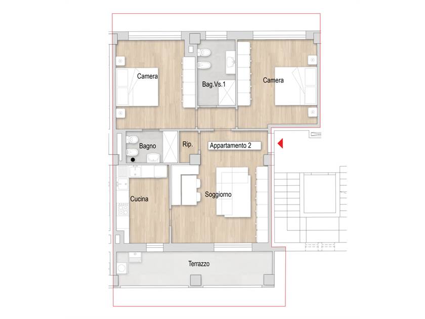 L'appartamento di circa 90 mq sarà composto da ingresso su soggiorno, cucina, ripostiglio, terrazzo a loggia di circa 13 mq , 2 camere matrimoniali e 2 bagni. Inoltre completerà la proprietà un ampio e comodo garage di circa 21 mq ubicato al piano terra.