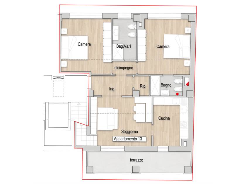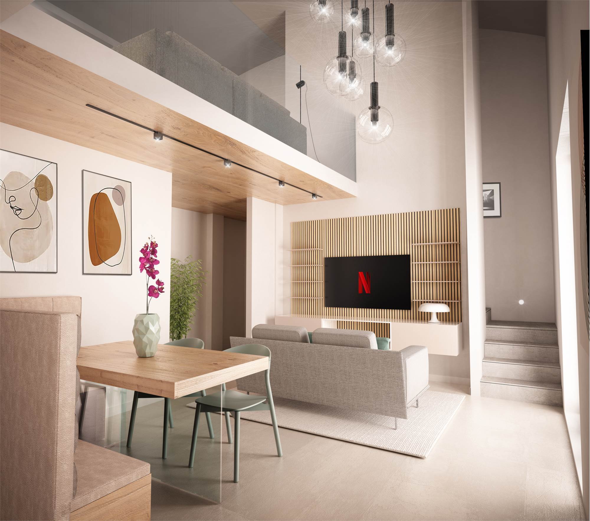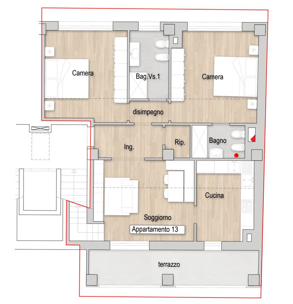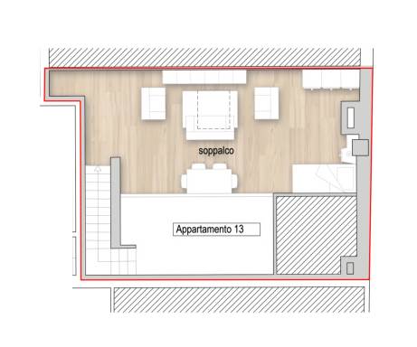 L'appartamento di circa 95 + 41 mq sarà composto da ingresso su soggiorno, cucina, ripostiglio, terrazzo a loggia di circa 14 mq , 2 camere matrimoniali, 2 bagni e splendido SOPPALCO DI 41 MQ completamente vivibile con affaccio sulla zona soggiorno. Inoltre completerà la proprietà un ampio e comodo garage di circa 21 mq ubicato al piano terra.