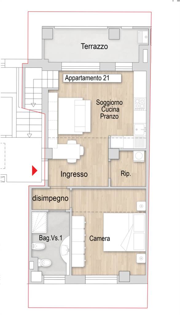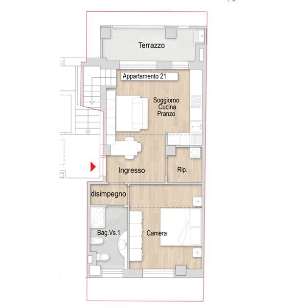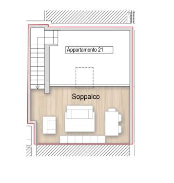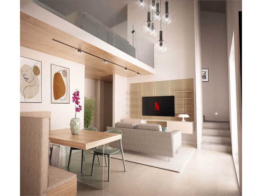 L'appartamento di circa 56+24 mq sarà composto da ingresso su soggiorno con angolo cottura, terrazzo a loggia di circa 9 mq, disimpegno, camera matrimoniale, bagno e splendido SOPPALCO DI CIRCA 24 MQ con affaccio sul soggiorno. Inoltre completerà la proprietà un ampio e comodo garage di circa 21 mq ubicato al piano terra.