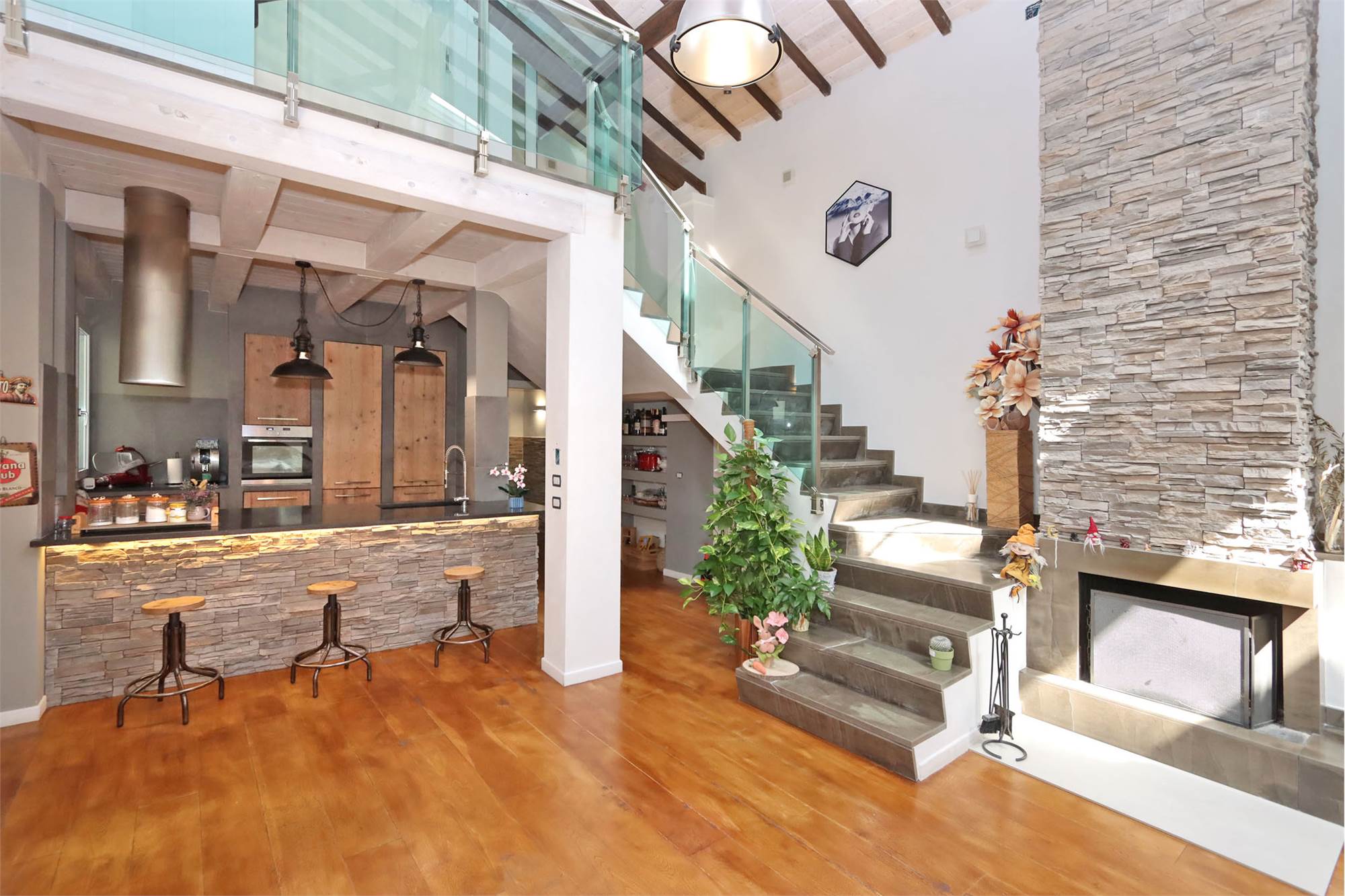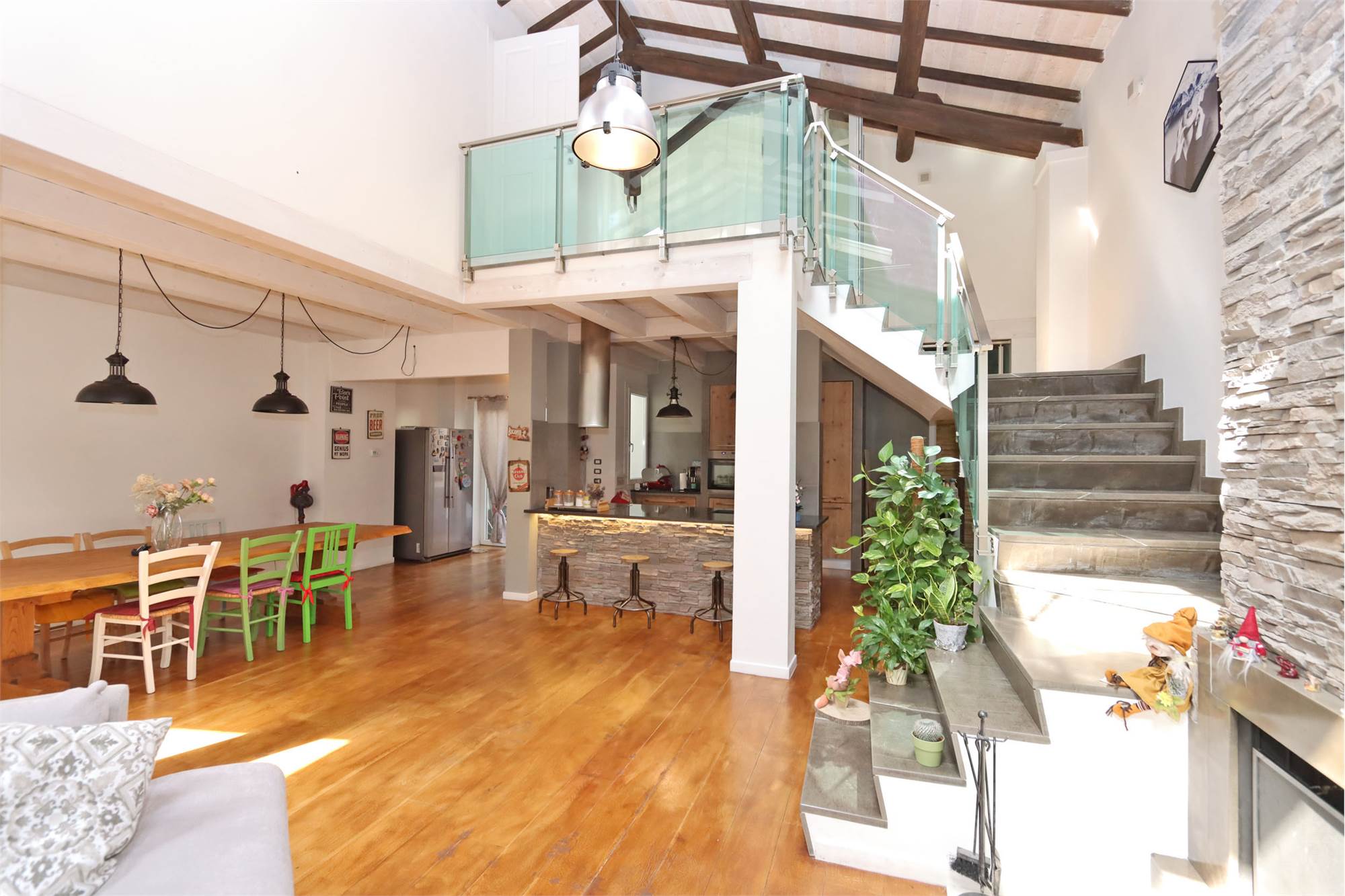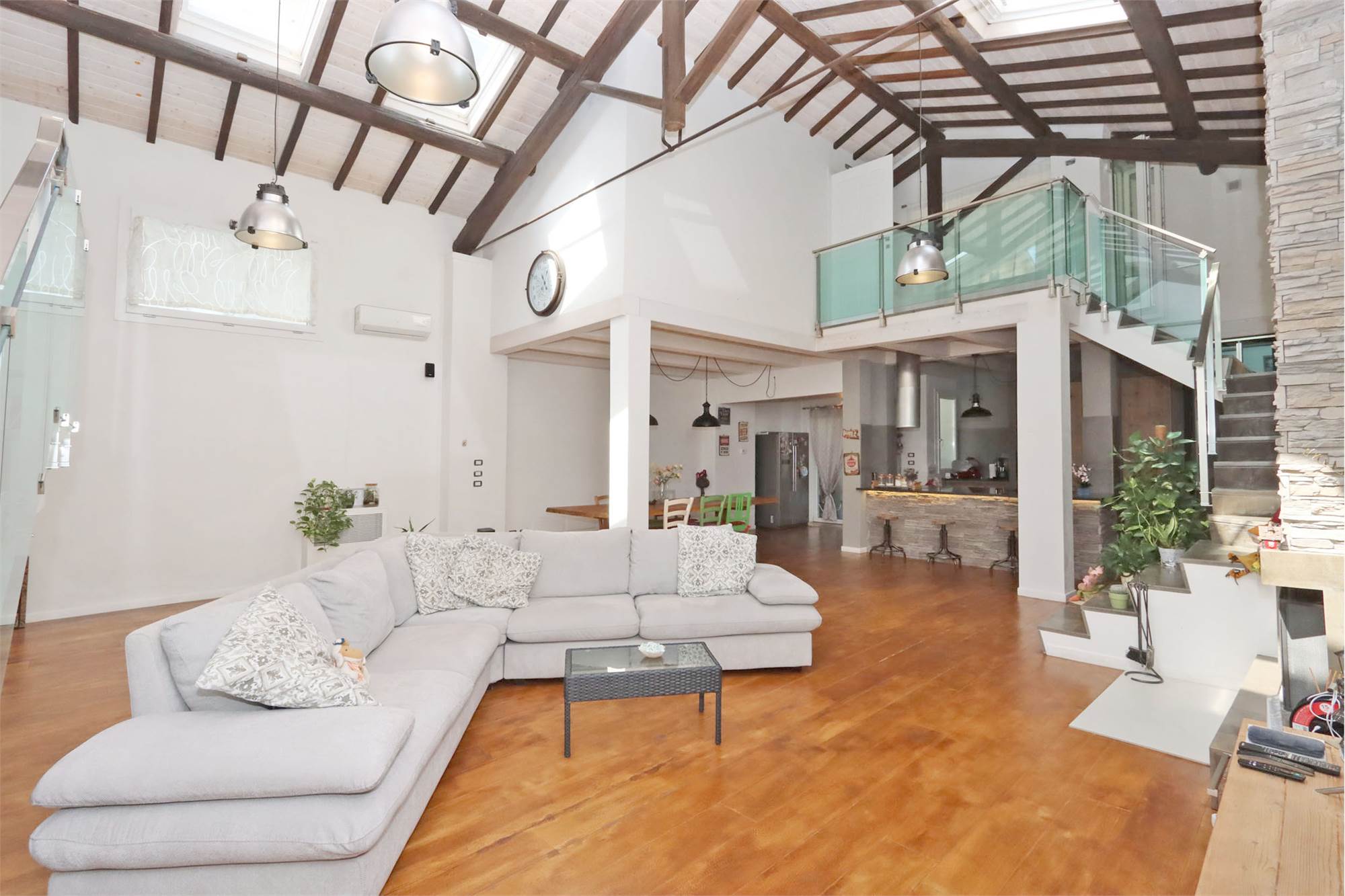 L'immobile si sviluppa su una superficie di 200 mq ed è composto da loggiato con ingresso che affaccia sul caratteristico SALONE openspace di 104 mq con camino e soffitti altissimi dotati di finestre Velux, cucina a vista (costruita con materiali di pregio e compresa nel prezzo) con isola, zona pranzo molto ampia, bagno finestrato, lavanderia e resede posteriore.