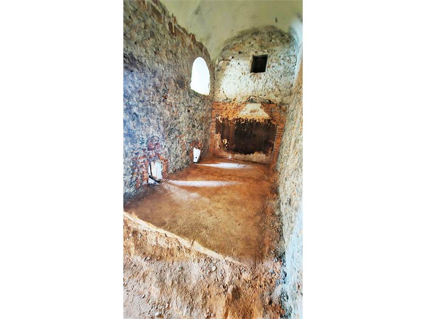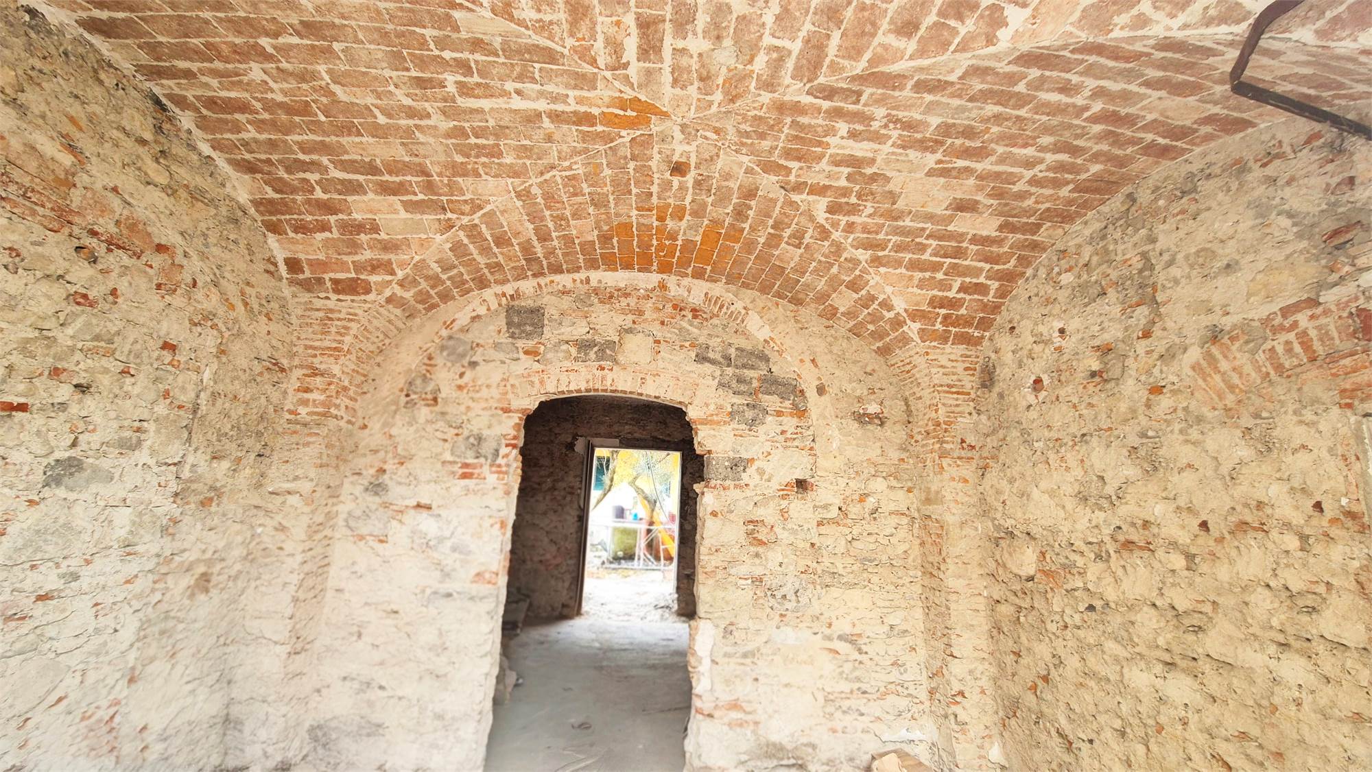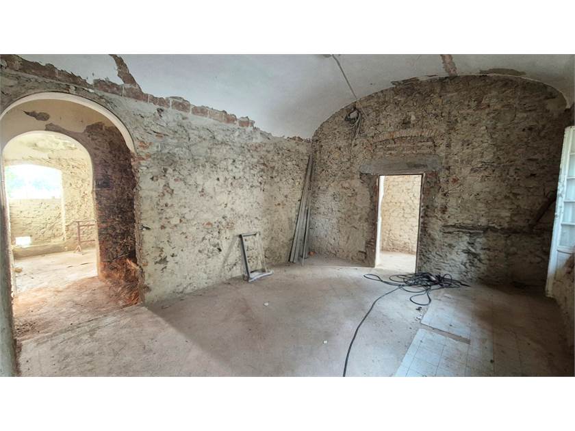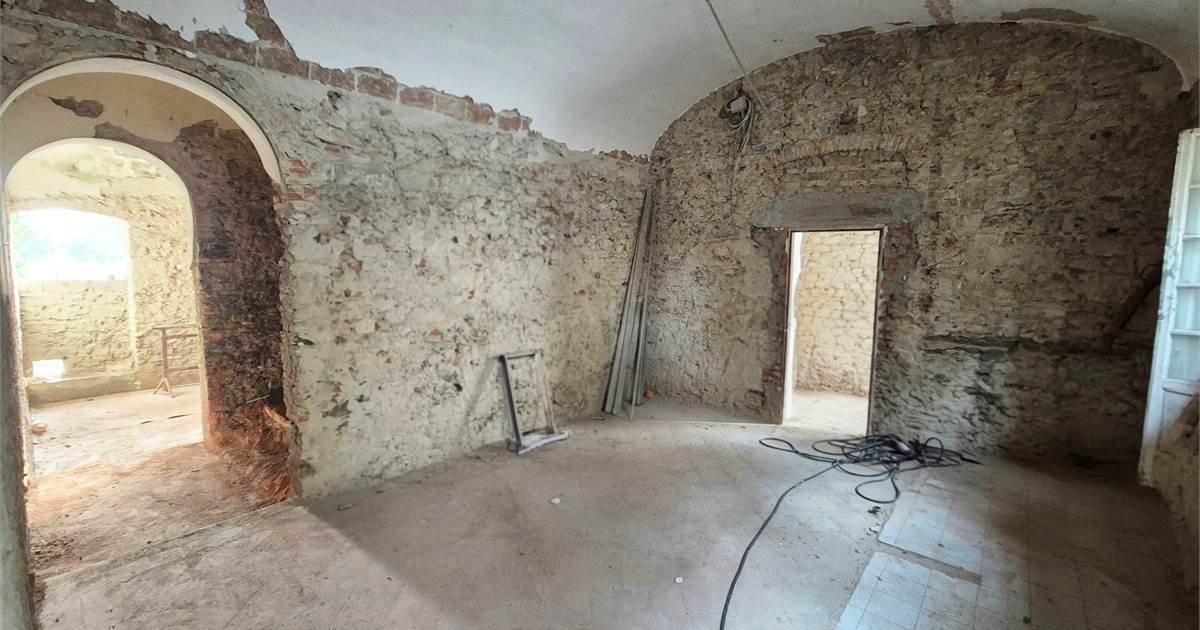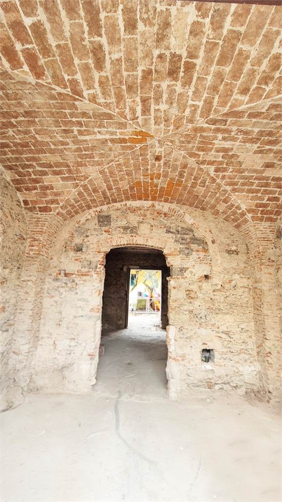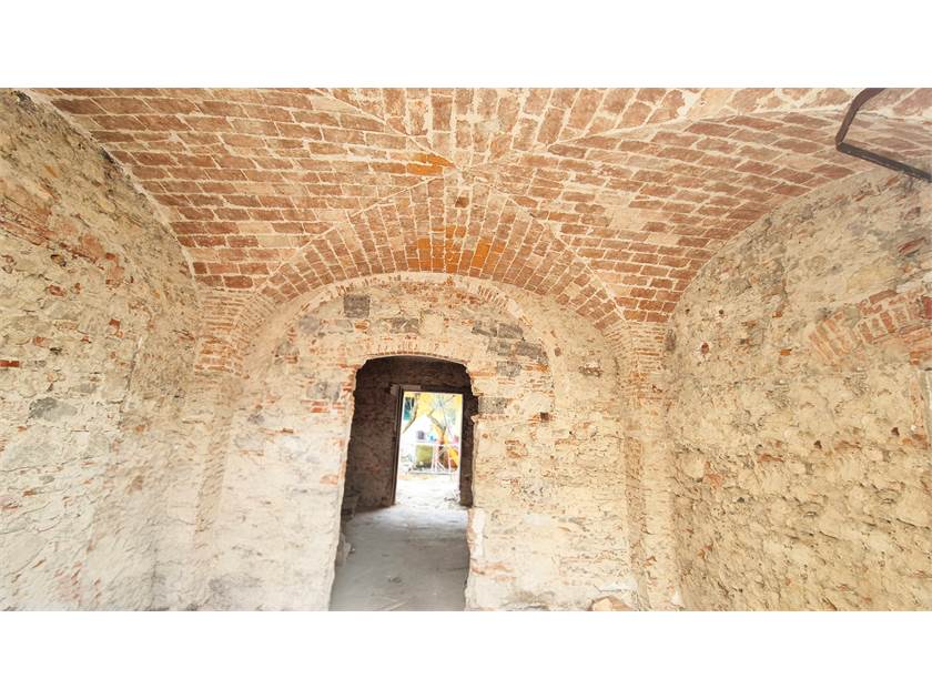 Il soggiorno è caratterizzato da un ampio portale vetrato ad arco e soffitto con volta a crociera completamente recuperato; oltre la sala troviamo una splendida cucina abitabile di 33 mq con voltine a mattoni faccia vista e l'accesso al giardino tergale.