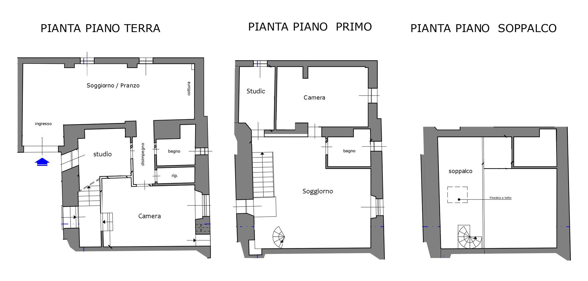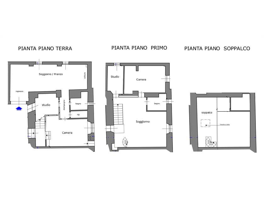 - PIANO TERRA: appartamento composto da ingresso, soggiorno con angolo cottura, camera matrimoniale, studio/camerina, bagno e ripostiglio.